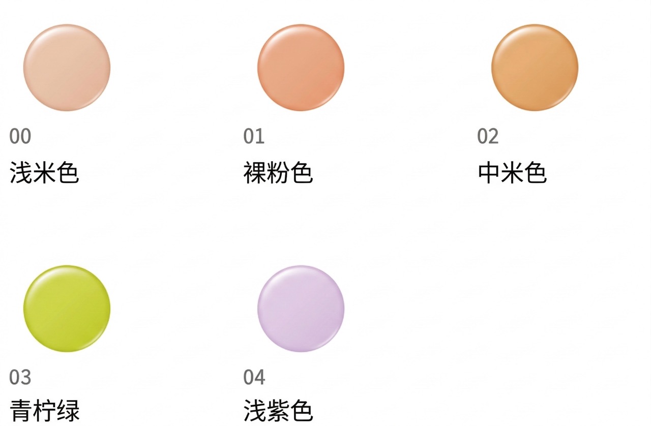 - 效果修正色(3色):00 浅米色(提亮暗沉)、03 青柠绿(修正泛红)、04 浅紫色(去除暗黄提升透明感)