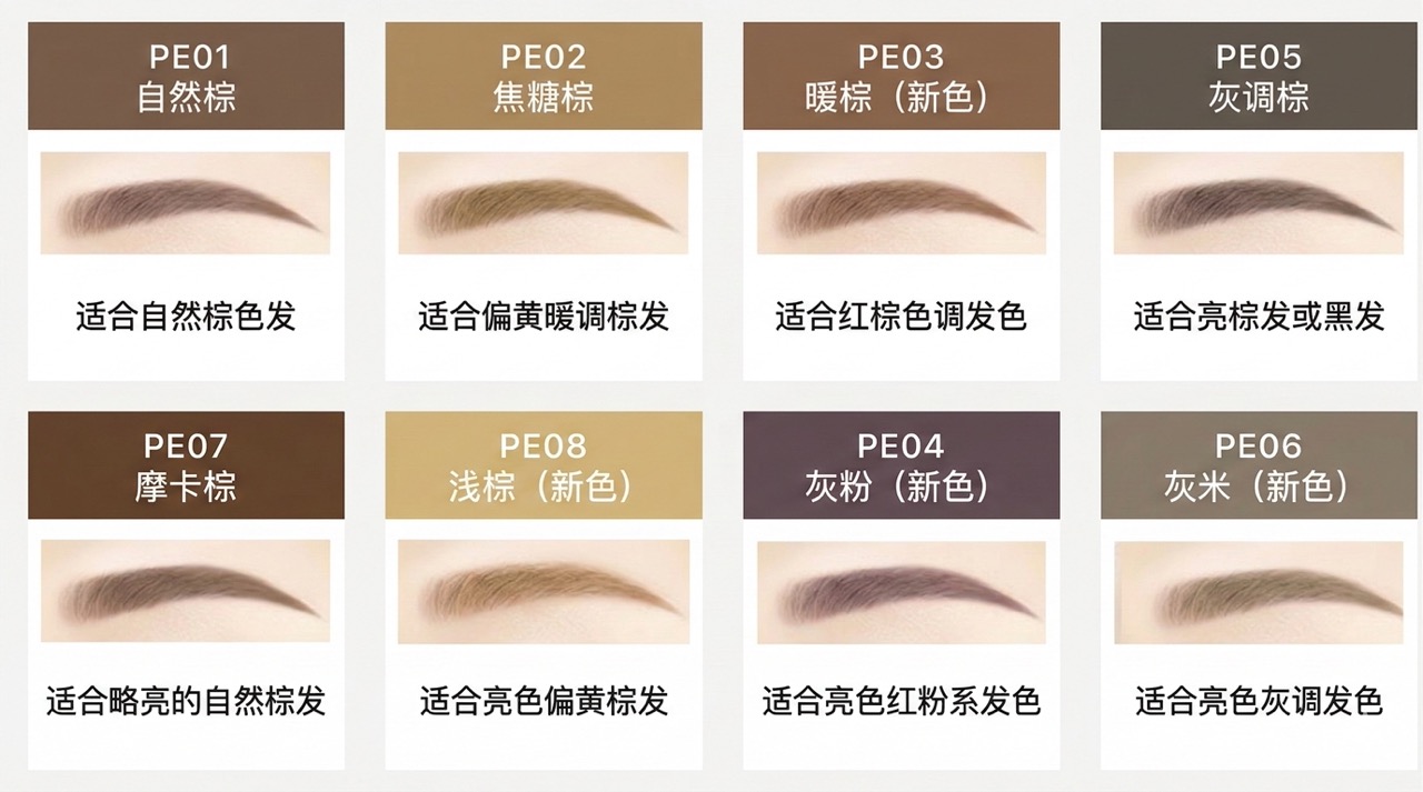 - 色号展开:全8色——PE01自然棕、PE02焦糖棕、PE03暖棕(新色)、PE04灰粉(新色)、PE05灰调棕、PE06灰米(新色)、PE07摩卡棕、PE08浅棕(新色)