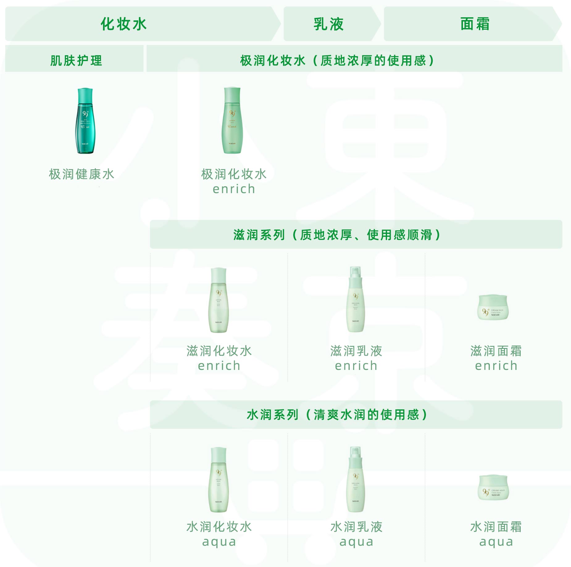 | 种类 | 极润健康水, 极润化妆水enrich, 滋润化妆水enrich, 滋润乳液enrich, 滋润面霜enrich, 水润化妆水aqua, 水润乳液aqua, 水润面霜aqua |